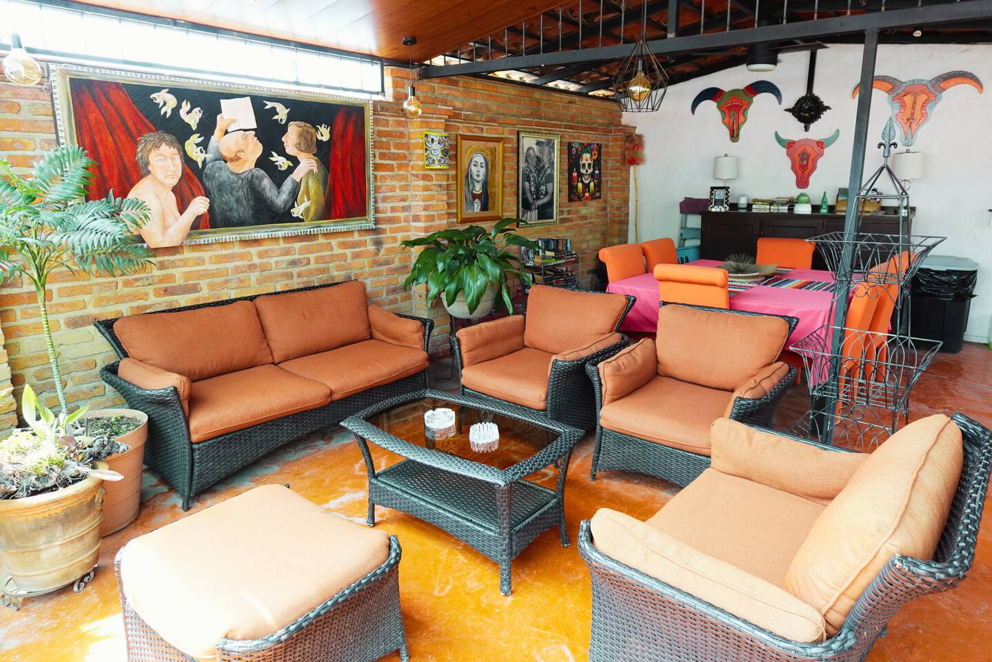 Be our guest at Inn Ajijic Vacation Rentals. Our first room, The Guest Room, is located on the second level of Inn Ajijic. This spacious room has an A/C split unit with heat, a sitting area with an L-shaped sofa, stone fireplace, whole building water filtration system with softener, luxurious king-sized bed with a hotel-grade mattress and custom bed coverings, a kitchenette with a mini refrigerator, hot plate for cooking, microwave, coffee maker, and dishes & glasses.